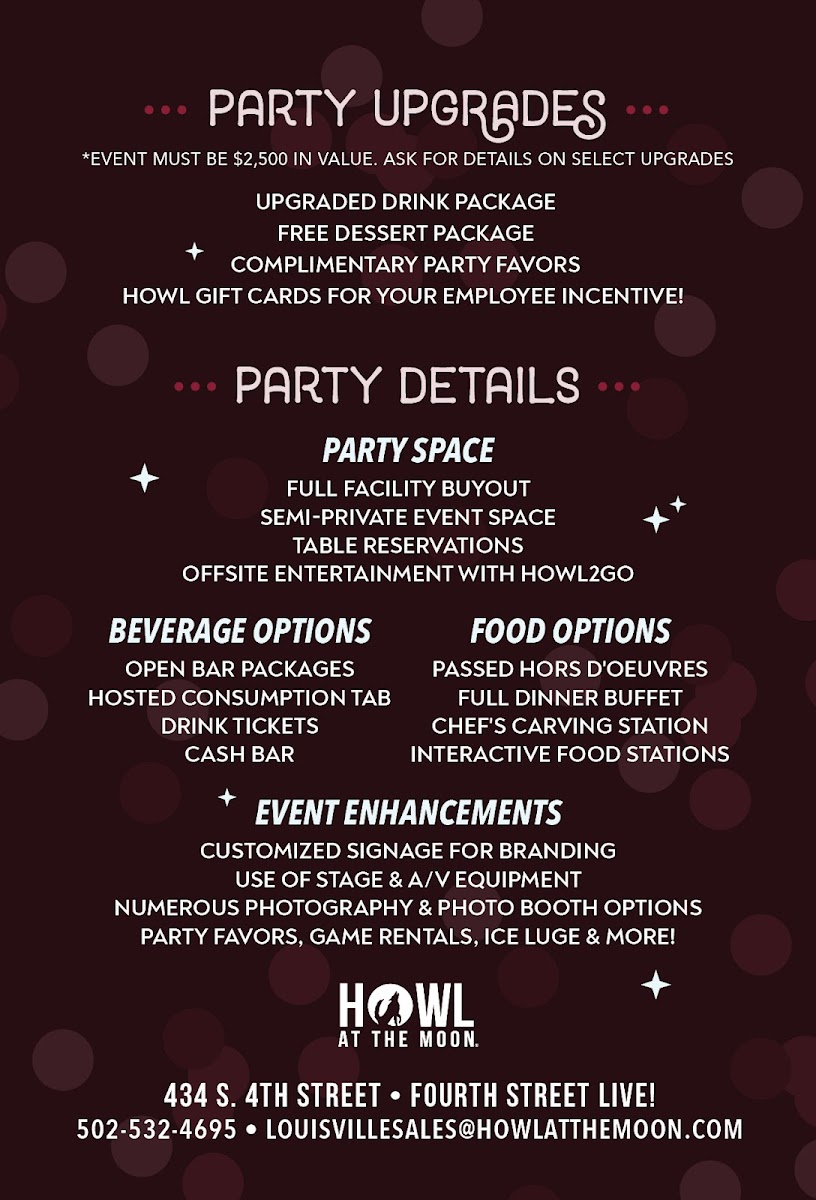 Welcome to Howl at the Moon Louisville, a vibrant hotspot nestled in the heart of Louisville, Kentucky, at 434 S 4th St. This dynamic venue offers a unique blend of live music and an electrifying atmosphere that is perfect for a night out with friends or a memorable celebration.